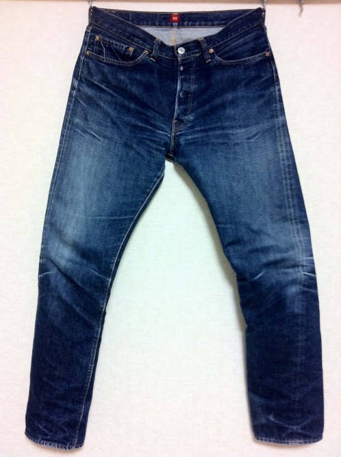フロントボタンや耳のアタリが見事です。ふくらはぎが、不思議な色落ちをしていますね!?